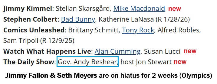 Friday, Feb. 6th (and the weekend) - Late-night talk show guest listings